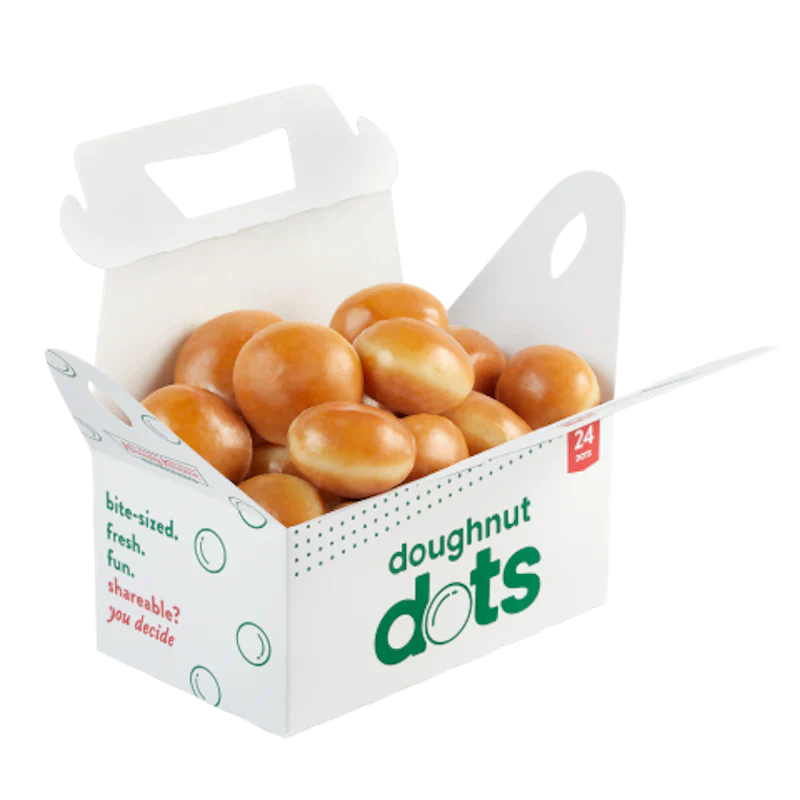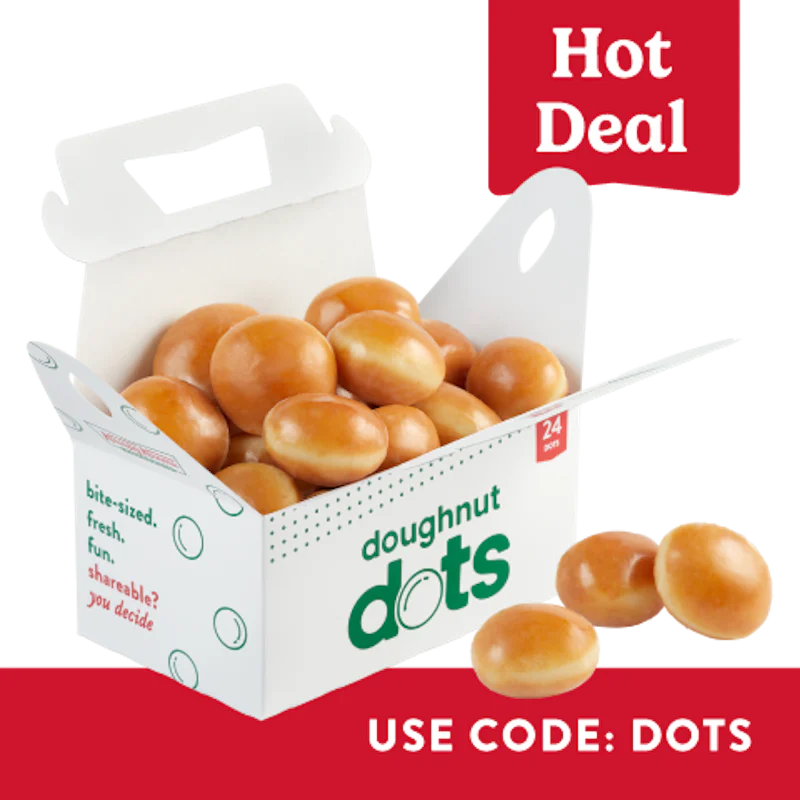 Get one 24 Count Original Glazed® Doughnut Dots for just $5 with any purchase of $5 or more. To redeem, add this item to your cart along with any other purchase of $5 or more then apply promo code: DOTS at checkout. Limit 1 redemption per guest. Minimum subtotal $5 required.