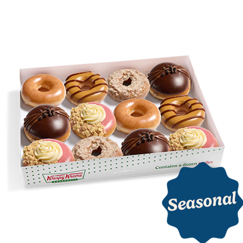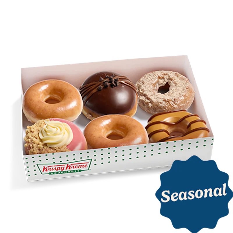 A seasonal 6 count assortment of specialty doughnuts including: (1) Chocolate Truffle Doughnut – An unglazed shell doughnut filled with chocolate truffle-flavored Kreme™, dipped in chocolate icing, finished with chocolatey drizzles, and topped with chocolate chips. (1) Raspberry Cheesecake Doughnut – An unglazed ring doughnut dipped in raspberry-flavored icing and graham crunch, finished with a swirl of cheesecake-flavored buttercreme. (1) Cinnamon Sugar Cake Doughnut –An Original Glazed® cinnamon old fashioned cake doughnut. (1) Caramel Dulce Doughnut – Our iconic Original Glazed® doughnut dipped in smooth caramel icing and finished with a salted caramel dulce drizzle. (2) Original Glazed® Doughnuts