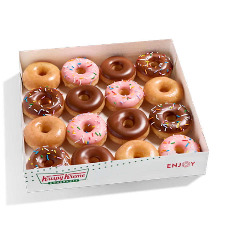 This assortment features 16 of our mini doughnuts. Each box includes: - (4) Original Glazed® Minis - (4) Strawberry Iced with Sprinkles Minis* - (4) Chocolate Iced with Sprinkles Minis - (4) Chocolate Iced Minis *Naturally & Artificially Flavored. Does not contain real strawberries.