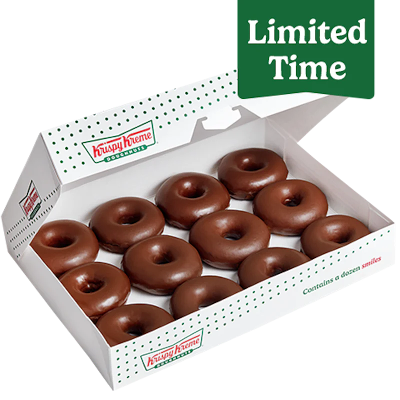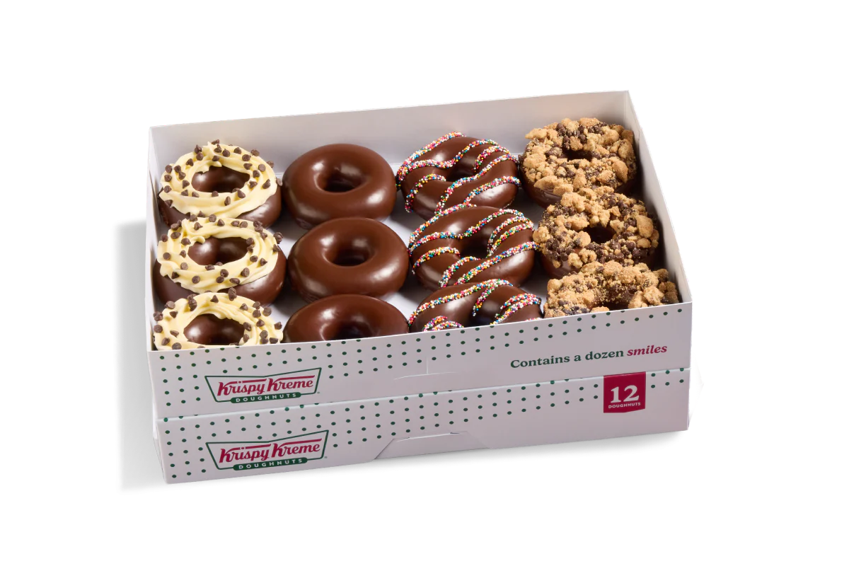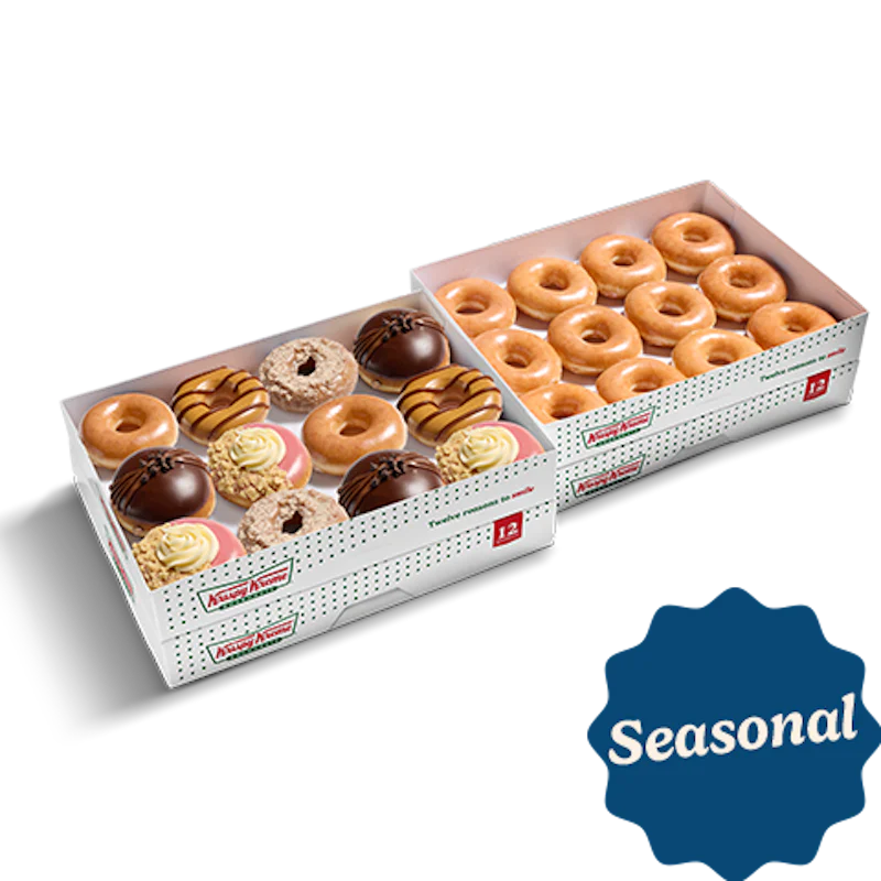 A seasonal dozen assortment of specialty doughnuts including: (3) Chocolate Truffle Doughnuts – An unglazed shell doughnut filled with chocolate truffle-flavored Kreme™, dipped in chocolate icing, finished with chocolatey drizzles, and topped with chocolate chips. (3) Raspberry Cheesecake Doughnuts – An unglazed ring doughnut dipped in raspberry-flavored icing and graham crunch, finished with a swirl of cheesecake-flavored buttercreme. (2) Cinnamon Sugar Cake Doughnuts –An Original Glazed® cinnamon old fashioned cake doughnut. (2) Caramel Dulce Doughnuts – Our iconic Original Glazed® doughnut dipped in smooth caramel icing and finished with a salted caramel dulce drizzle. (2) Original Glazed® Doughnuts