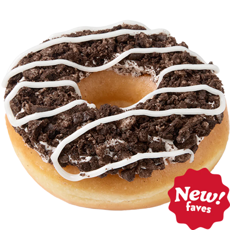 The OREO® Cookies & Kreme Doughnut is an OREO®-loaded delight. This unglazed doughnut is filled with delicious Cookies & Kreme™ filling, dipped in chocolate icing, topped with crunchy OREO® cookie pieces, and finished with a drizzle of vanilla flavored icing for that classic OREO® look and flavor.
