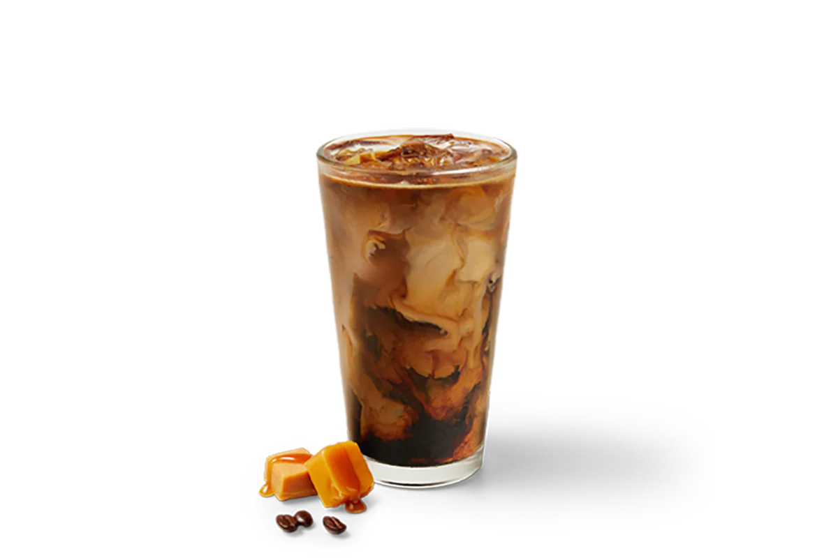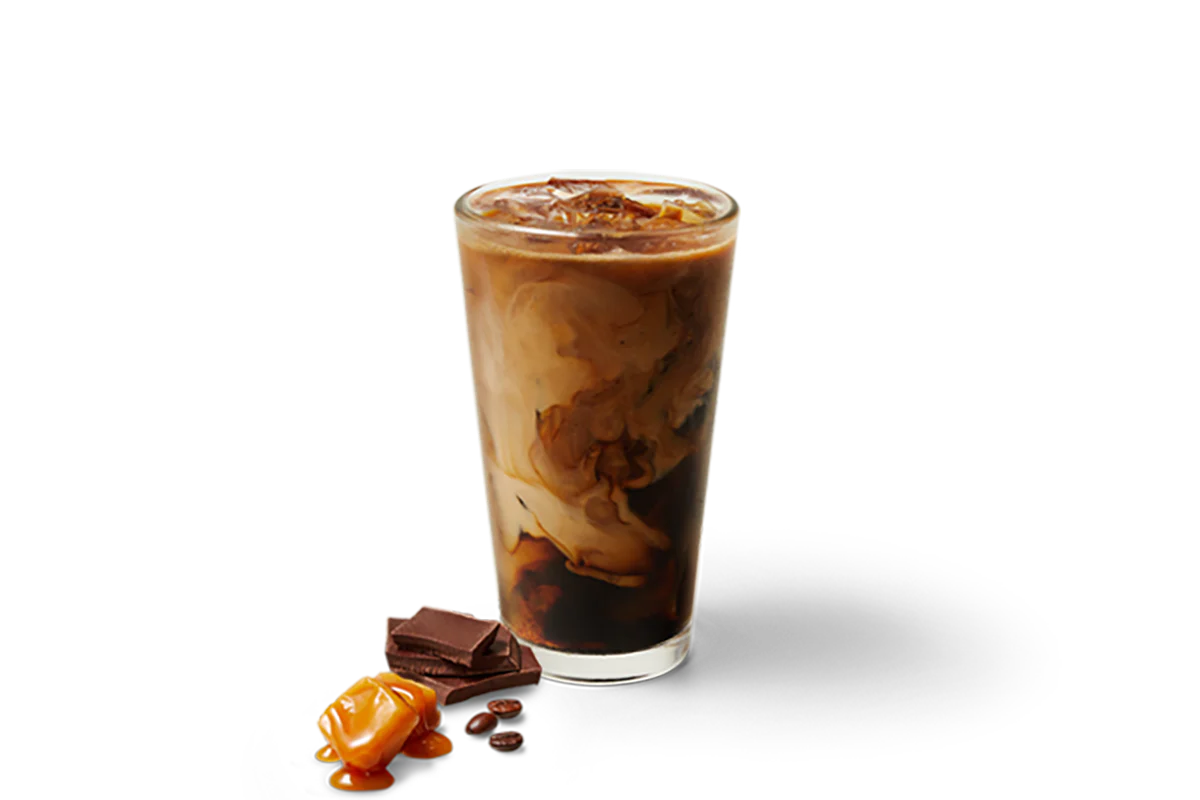 Naturally Flavored. Rich iced coffee blended with a caramel chocolate sauce, served over ice and topped with a splash of 2% milk.