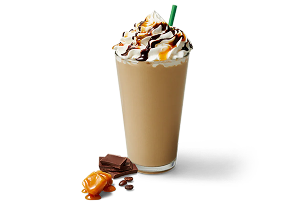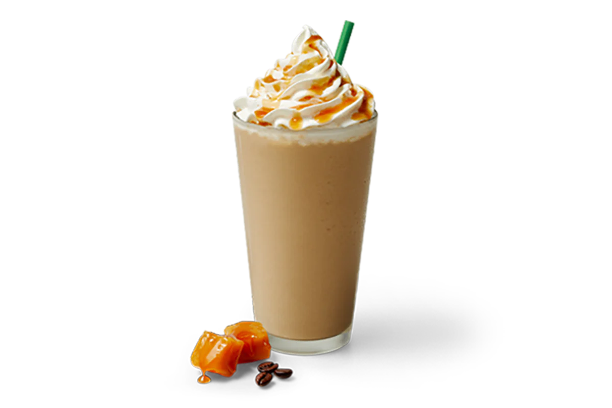 Creamy caramel and espresso, blended with ice, and topped with whipped cream and a caramel drizzle.
