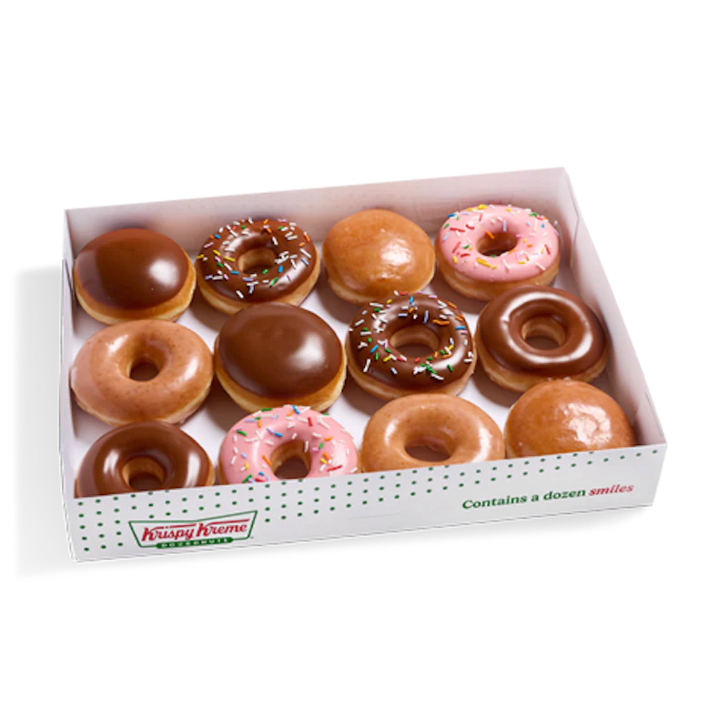 An assortment of our classic doughnuts including: - (2) Original Glazed® Doughnuts - (2) Chocolate Iced Doughnuts - (2) Strawberry Iced with Sprinkles Doughnuts - (2) Chocolate Iced Kreme™ Filled Doughnuts - (2) Original Glazed® Raspberry Filled Doughnuts - (2) Chocolate Iced with Sprinkles Doughnuts