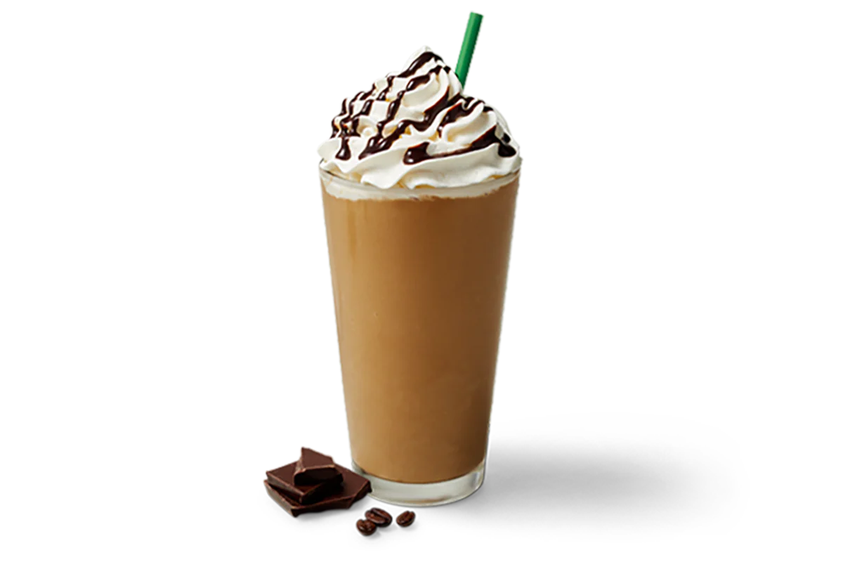 A creamy blend of decadent chocolate, espresso and ice, topped with whipped cream and a chocolate drizzle.