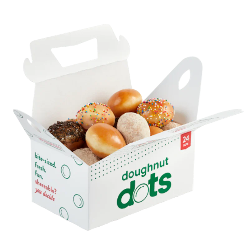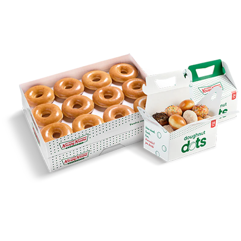 Whether you’re fueling a morning meeting or treating a group on the go, the Glaze & Go Bundle serves up to 36 people and is ready to satisfy. This bundle features: - (2) Original Glazed® Dozens - (2) 24 Count Assorted Doughnut Dots – bite-sized and perfect for sharing! Each 24 Count Assorted Doughnut Dots box includes (8) Original Glazed® Doughnut Dots, (4) Cookie Crumb Doughnut Dots, (4) Cinnamon Doughnut Dots, (4) Powdered Doughnut Dots, and (4) Sprinkled Doughnut Dots.
