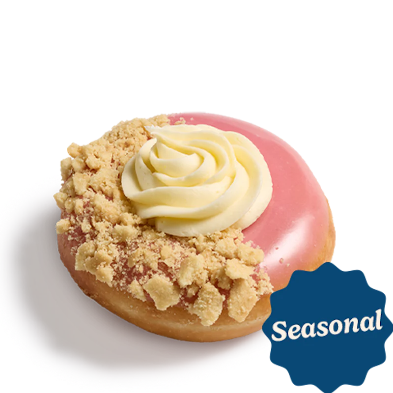 An unglazed ring doughnut dipped in raspberry-flavored icing and graham crunch, finished with a swirl of cheesecake-flavored buttercreme for a bright, creamy winter treat. Artificially Flavored.